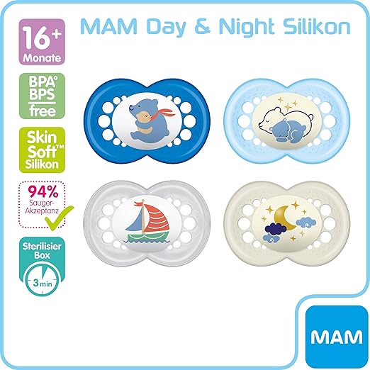 Mam Day Night Schnuller Set Im 4er Set 2x Mam Original Und 2x Mam Night Zahnfreundlicher Silikonschnuller Aus Speziellem Mam Skinsoft Silikon Mit Schnullerbox 0 6 Monate Bar Dino Mond Amazon De Baby